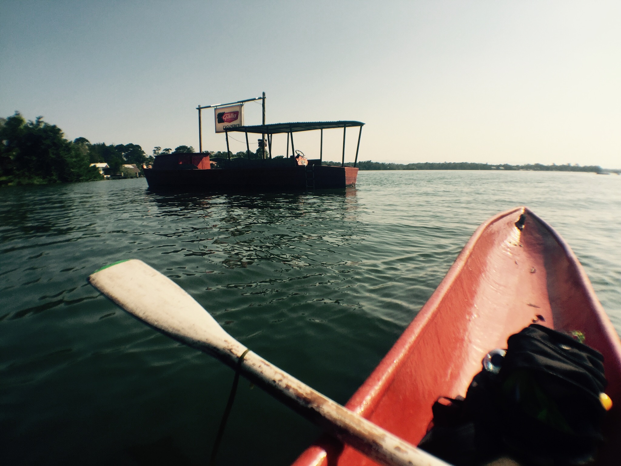 Es läuft Frank Sinatra mit «Love`s been good to me». Im Wasser schnappen Schildkröten nach Luft. Es ist ruhig, Bruno sitzt an der Bar, schaut etwas nach in seinem Bestellungsbuch. Da ist noch so ein alter Typ, mit langem weissen Bart, er liest in einem Buch. Ich merke sofort, hier tickt die Uhr anders. Hier gibt’s nie Stress. Geht gar nicht. Ich höre nach wie vor nur die Musik, sie passt so fest nicht, dass sie eben schon wieder passt. Frank Sinatr…nein inzwischen ist es Scharlachrot von Patent Ochsner. Dazu hört man den Jungle, die Tiere, die Grillen. Ab und zu pflutscht es, wenn ein Fisch aus dem Wasser springt. Beim Essen sehe ich einen jungen Typ mit Bart, so in meinem Alter, etwas alternativ gekleidet. Er nimmt sich ein Kanu und fährt einfach weg. Ich frage Bruno, wohin der denn geht. Bruno zeigt mit die kleinen Schiffli. Ich können einfach jederzeit eins nehmen und zum Floss raus, auf den See paddeln. Das gehöre zu ihnen. Das sei quasi ihre Beach. Ich kanns nicht erwarten, will meine Bratwurst mit übrigens bester Zwiebelsauce ever, schnell verschlingen. Der alte Mann mit weissem Bart schaut mich etwas schräg an. «Dieser gestresste Typ aus der Zivilisation», denkt er sich bestimmt. Okay, easy Remo, eins nach dem anderen. Hier macht man nichts schnell.