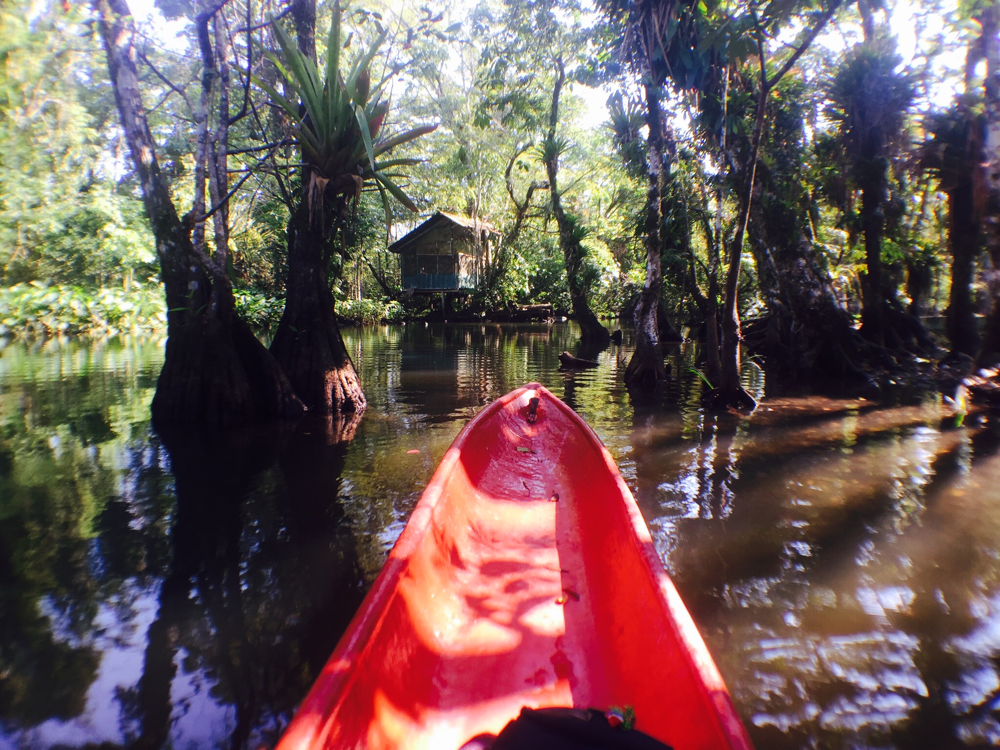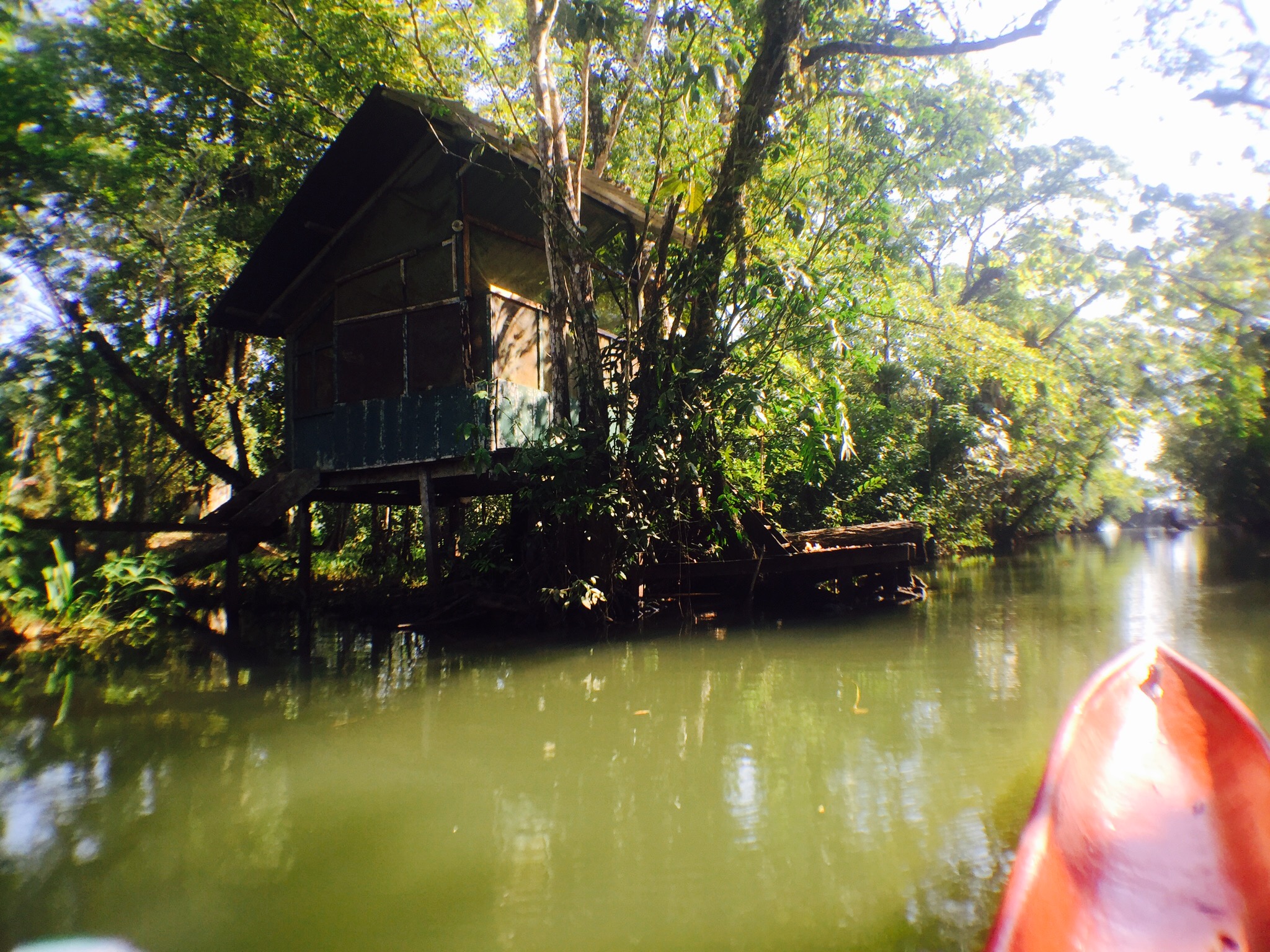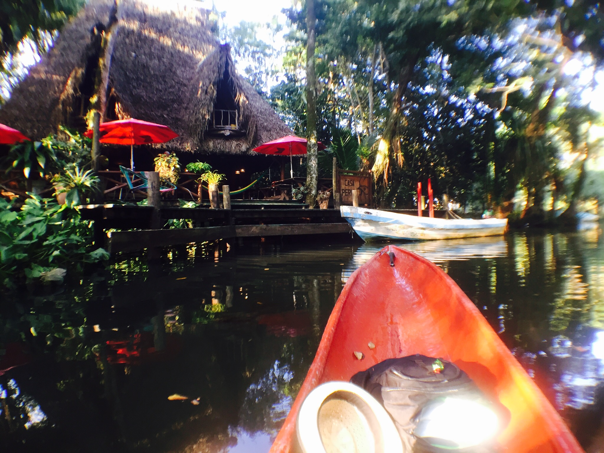 Zwei Minuten Fussmarsch vom Bushof aus wartet bereits das Hostelschiffli auf mich. Es geht raus auf den breiten Fluss. Rechts und links Jungle. Plötzlich biegt er links ab. Wir fahren mit dem Schiff durch die Wälder, das erste Mal bin ich sprachlos. Das ist sooo toll. Dann bin ich am Ziel, beim Hostel «Casa Perico». Mitten im Fluss-Jungle steht da ein Haus, umgeben von kleinen Häuschen, gebaut auf Holzpfeiler. Ich bin völlig aus dem Häuschen.