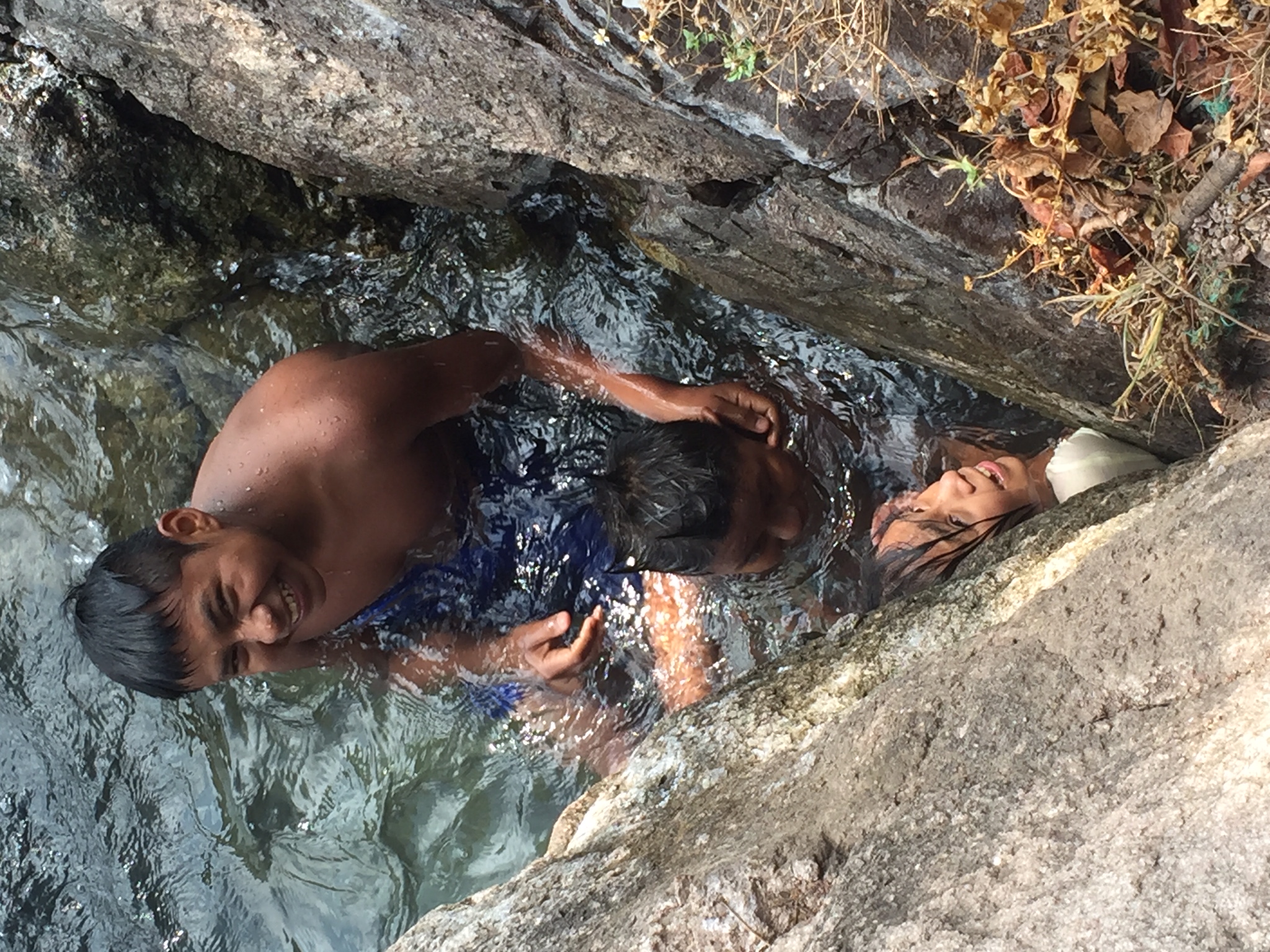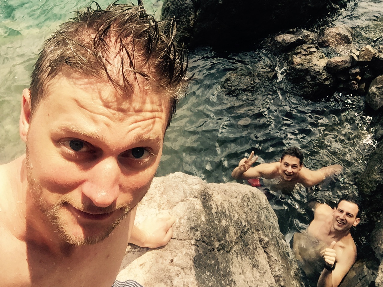Bei Santa Catarina hätte es so heisse Quellen, die von den Vulkanen in den See fliessen. Wir fanden sie, die Quelle. Tatsächlich spürten wir bei diesem Felsen ganz leicht lauwarmes Wasser. Wir haben uns aber gefragt, ob da nicht die einheimischen Kinder dafür zuständig sind, diese «Quelle» warm zu halten…