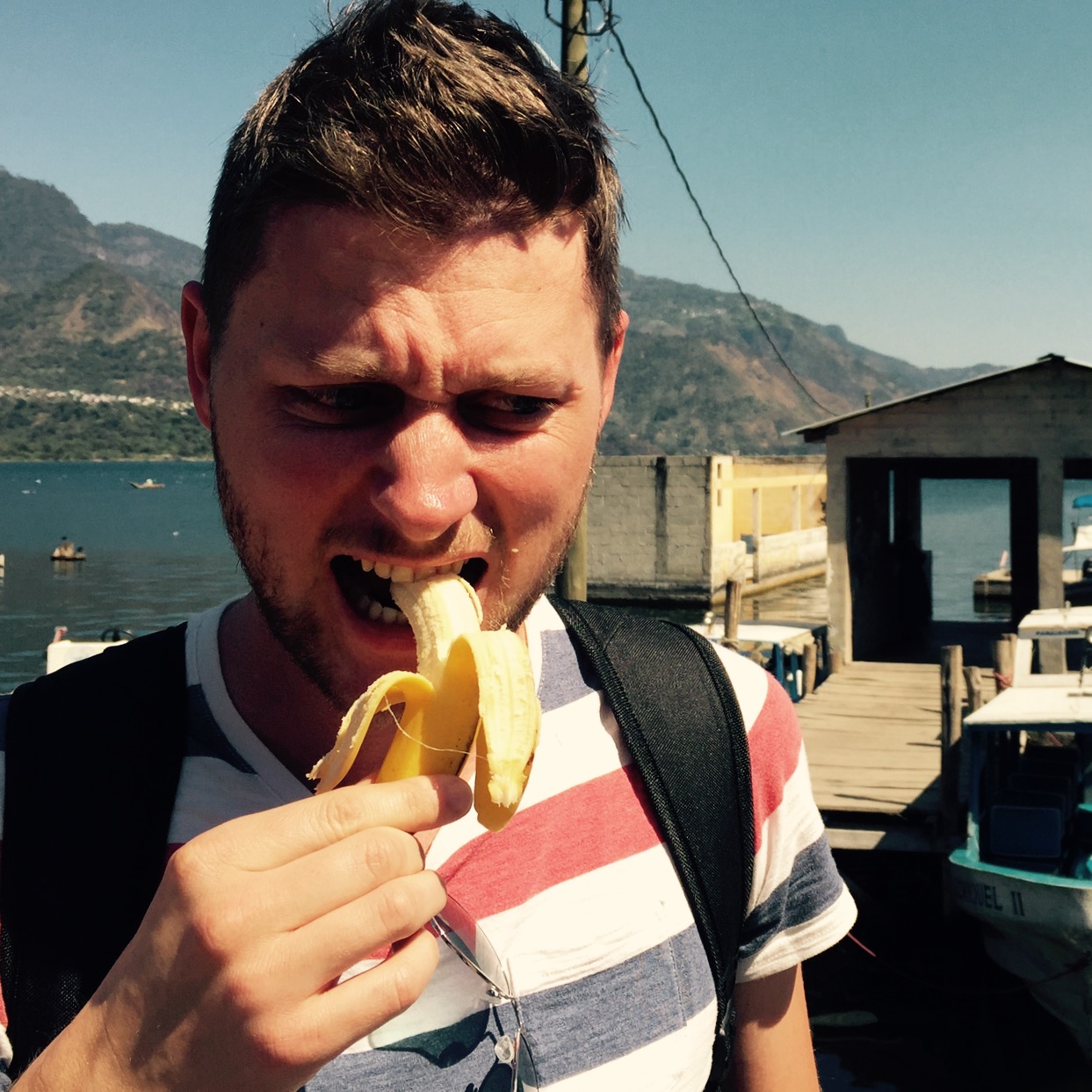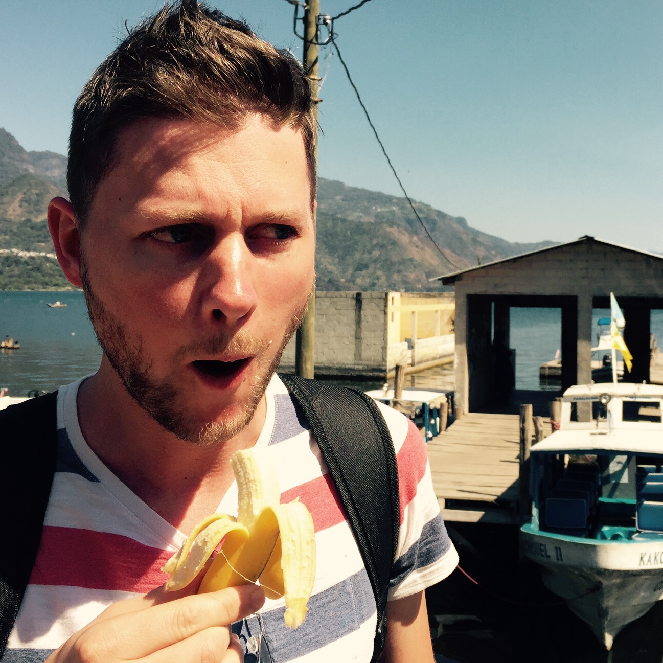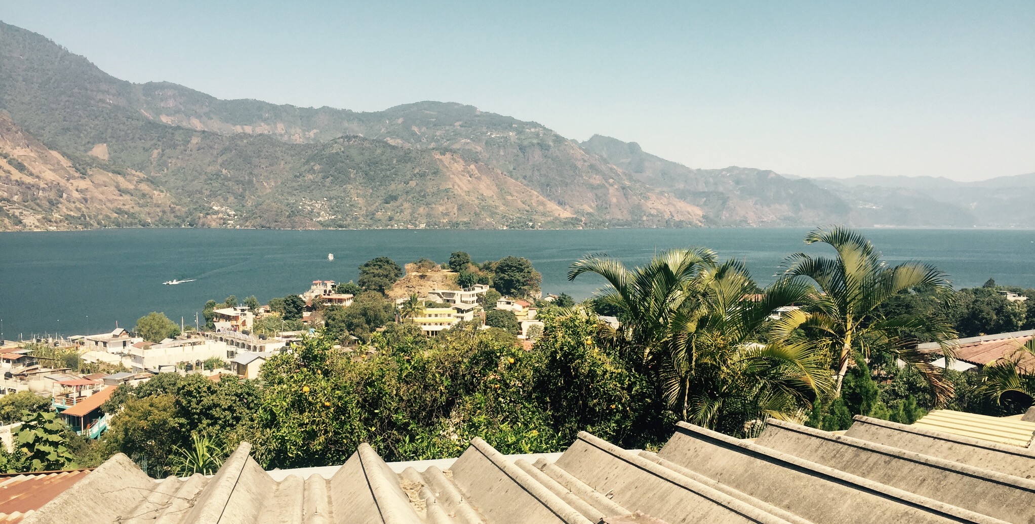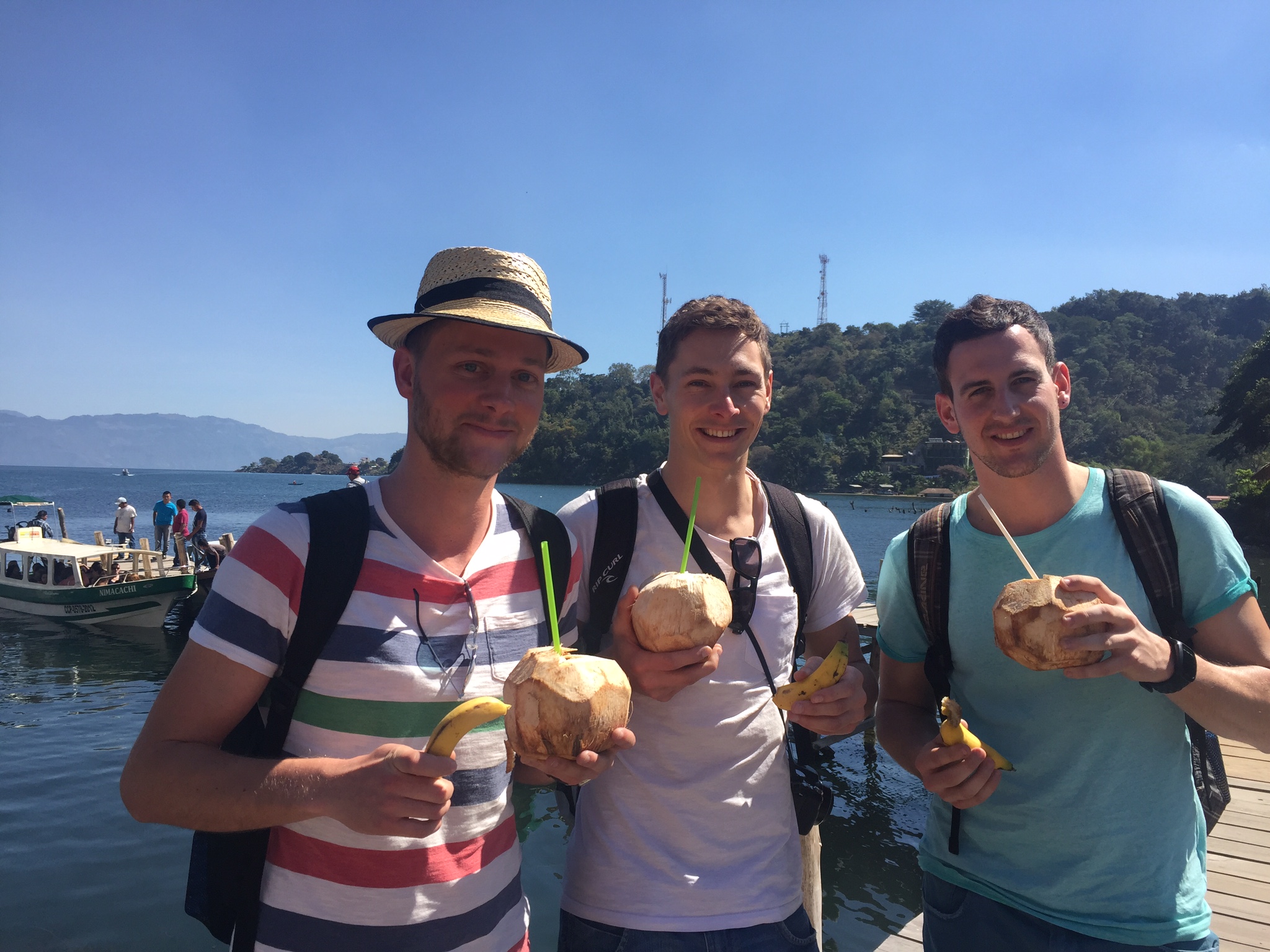 Aber, nach drei Stunden über Guatemaltekisches Berggebiet, haben wirs geschafft. Panajachel war das Ziel. Ein recht hässliches Örtchen direkt am Atitlan-See, auf 1600 Metern Höhe. So ein Tourikaff. Im Hotel eingecheckt, begannen wir rasch die geführte Schiffstour. Erster Halt: San Juan, ein herziges Künstlerdorf. Vor wirklich atemberaubender Kulisse malen und weben die Menschen ihre Bilder und Schale. Wir tranken eine Kokosnuss und assen eine kleine Banane. Es war die Beste in meinem Leben!!