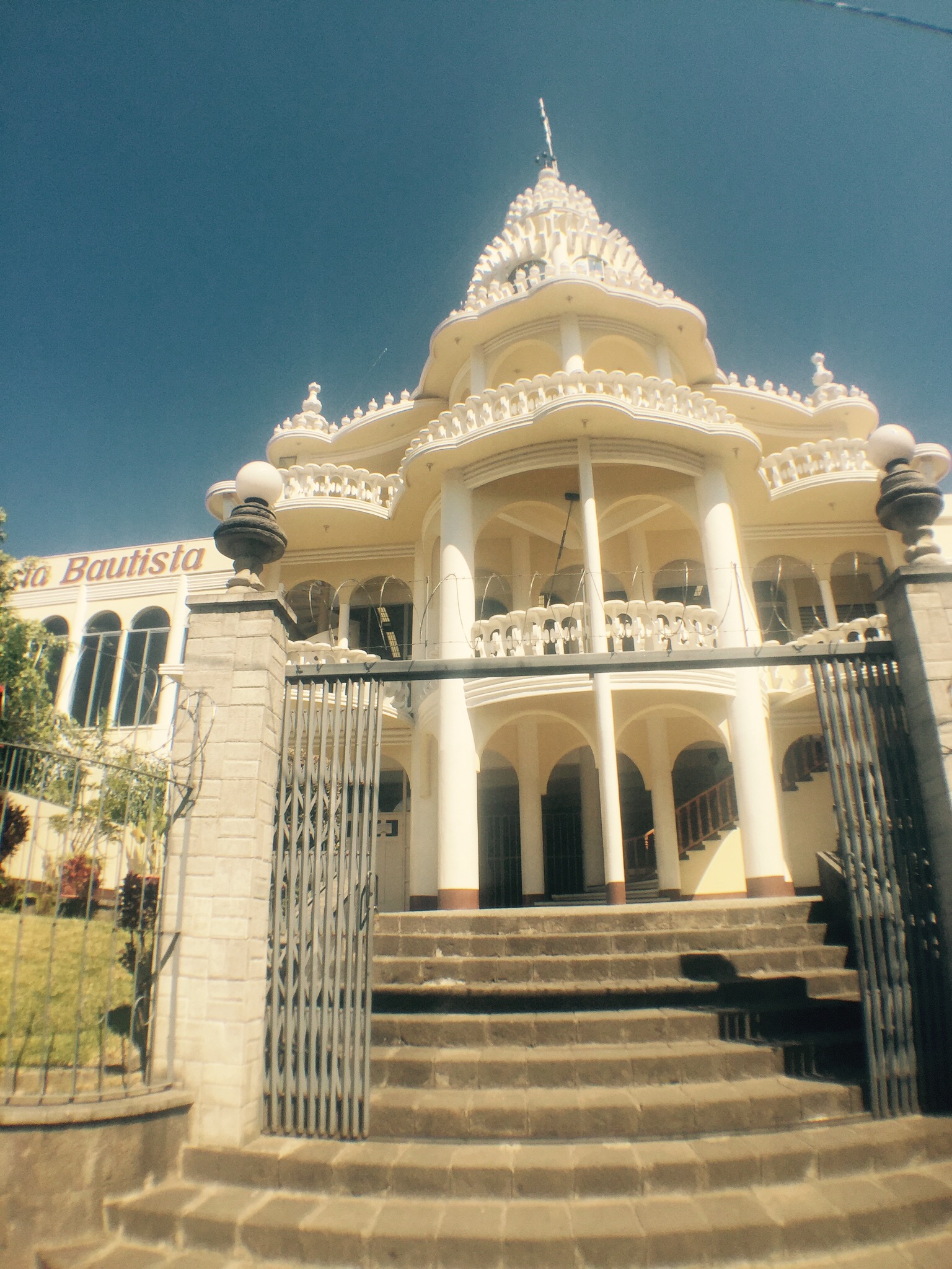 Die Hauptstrasse führt vom See den Hügel hinauf. Auf beiden Seiten verrückte Märkte und Menschen. Hippies und Einheimische. imageDie roten Tucktucks rasen in halsbrecherischer Geschwindigkeit nur wenige Centimeter an den Menschen vorbei. Bireweich ist das… Auf der anderen Seite strotzt die Stadt nur so von Leben! Ausser natürlich man zieht ein paar mal zu viel..dann ist da für ein paar Stunden nicht mehr viel Leben… Vorne am See das pulsierende Städtchen, hinten am Hang die Blechhütten der Armen. Und mittendrin, die Kirche. Während viele Häuser einen höchst renovationsbedürftigen Eindruck machen, sieht die Kirche perfekt aus, keinen Kratzer am Verputz. Wir hörten, dass man da rein kann. Ich bin sonst nicht so heiss darauf, jede Kirche auch noch von innen zu sehen. Diese hat uns aber gereizt.