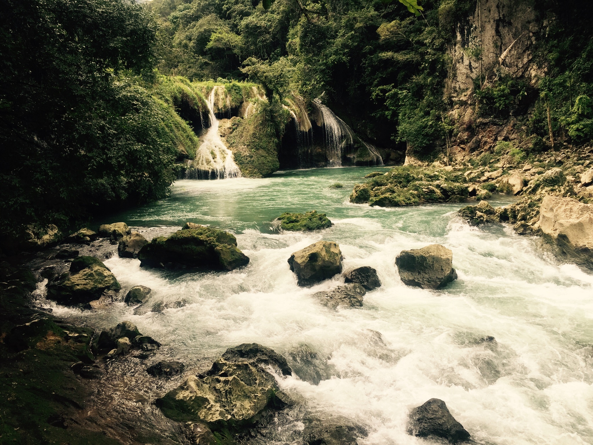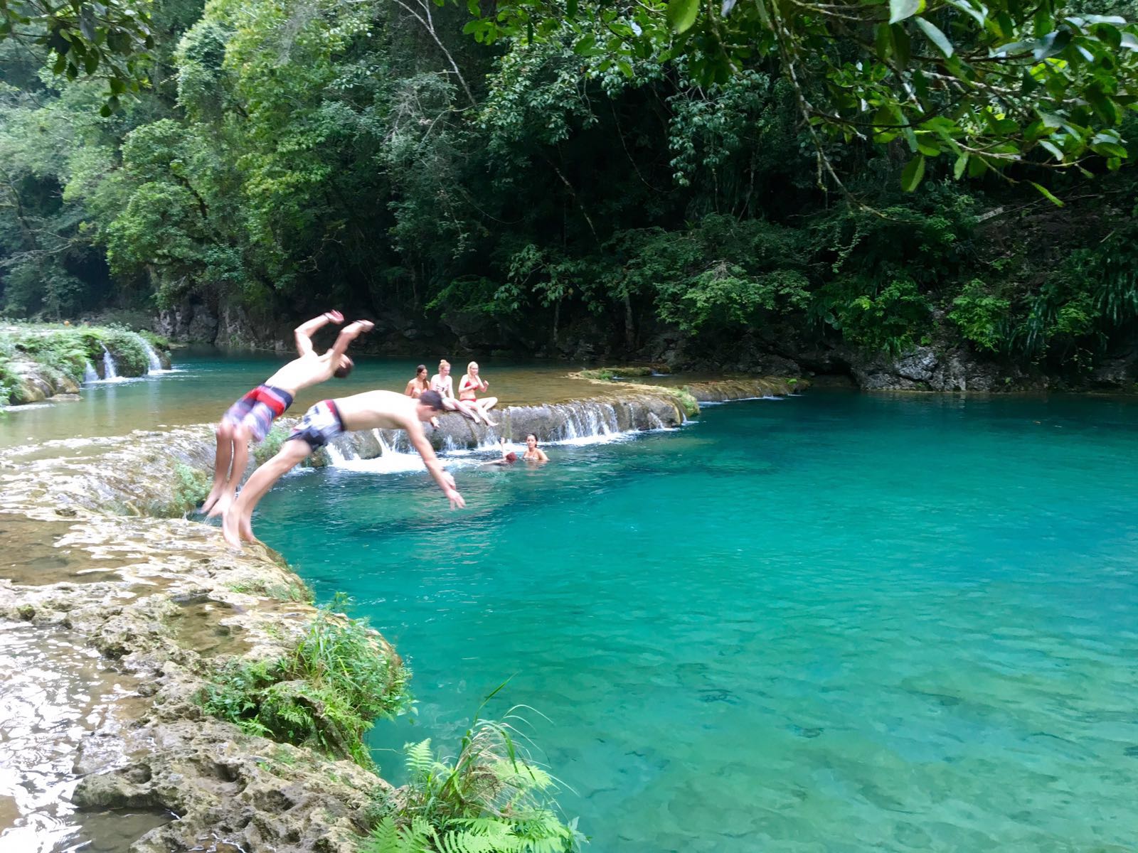Im Bus von Antigua nach Rio Dulce habe ich Laura aus Frankreich und Esther aus Deutschland kennengelernt. Wie es der Zufall will, treffen wir uns ein paar Tage später wieder. Wir mögen uns, haben die selben Pläne, reisen darum zusammen weiter. Semuc Champey heisst das erste Ziel. Ein Naturparadies, als eines der Highlights von Guatemala wurde es mir mehrmals wärmstens empfohlen. Einen Schweizer mit Bergen und Wasserfällen zu beeindrucken ist jedoch nicht ganz einfach. Der Weg dort rauf ist beschwerlich. Bei uns ginge das knapp als Wanderweg durch. In Guatemala fahren Busse im stundentackt, stundenlang auf löchrigen Schotterstrassen da rauf.