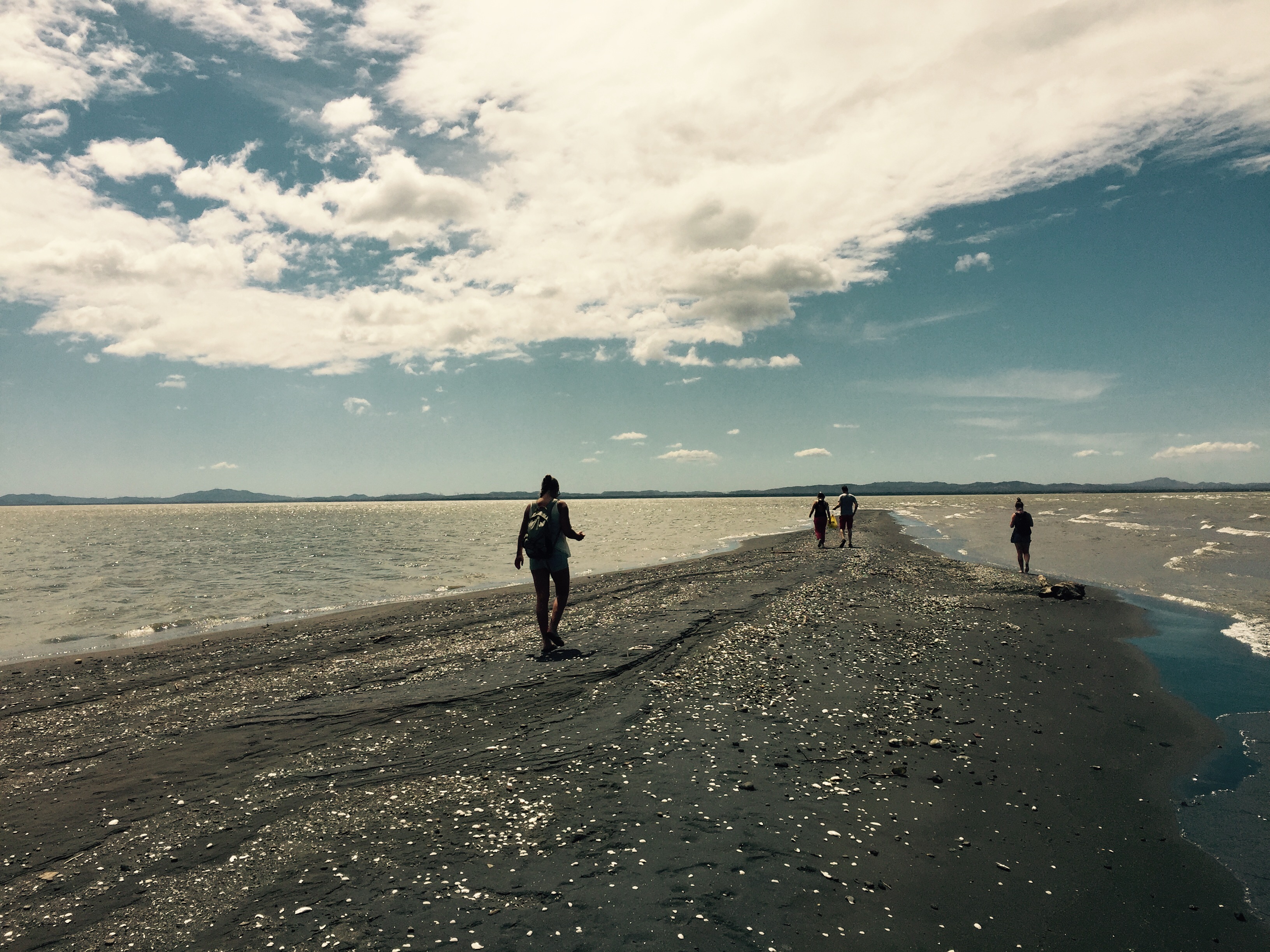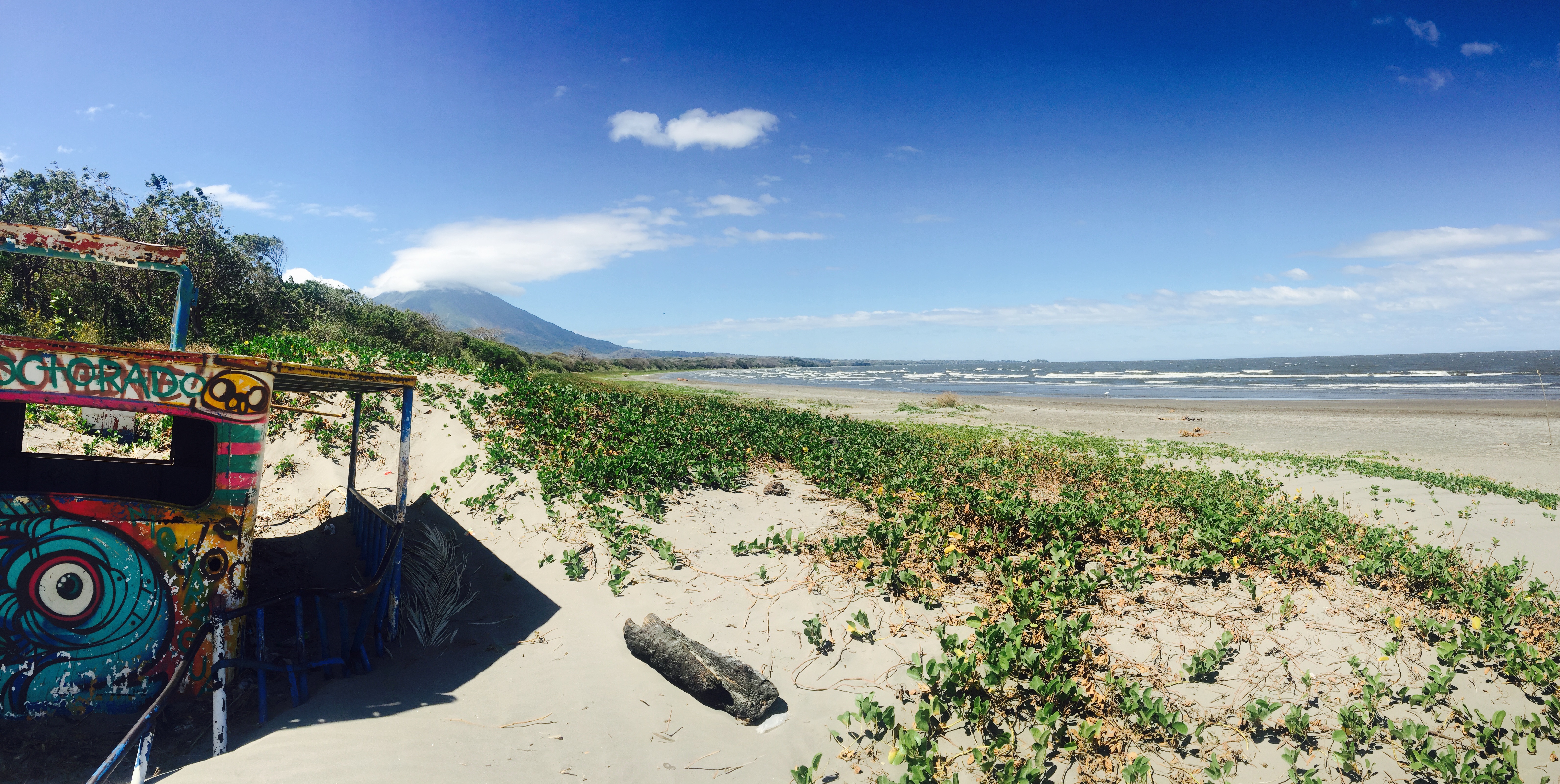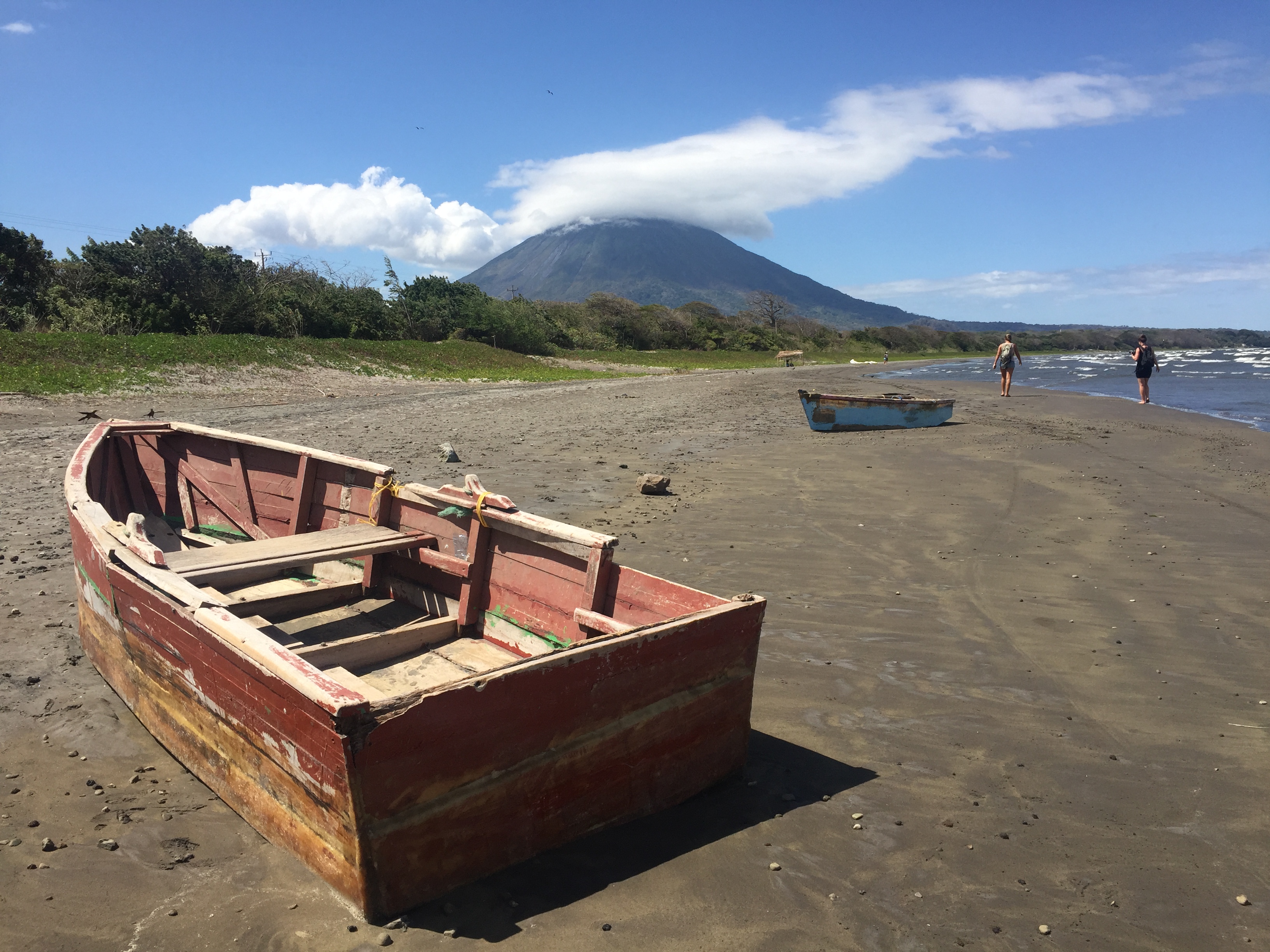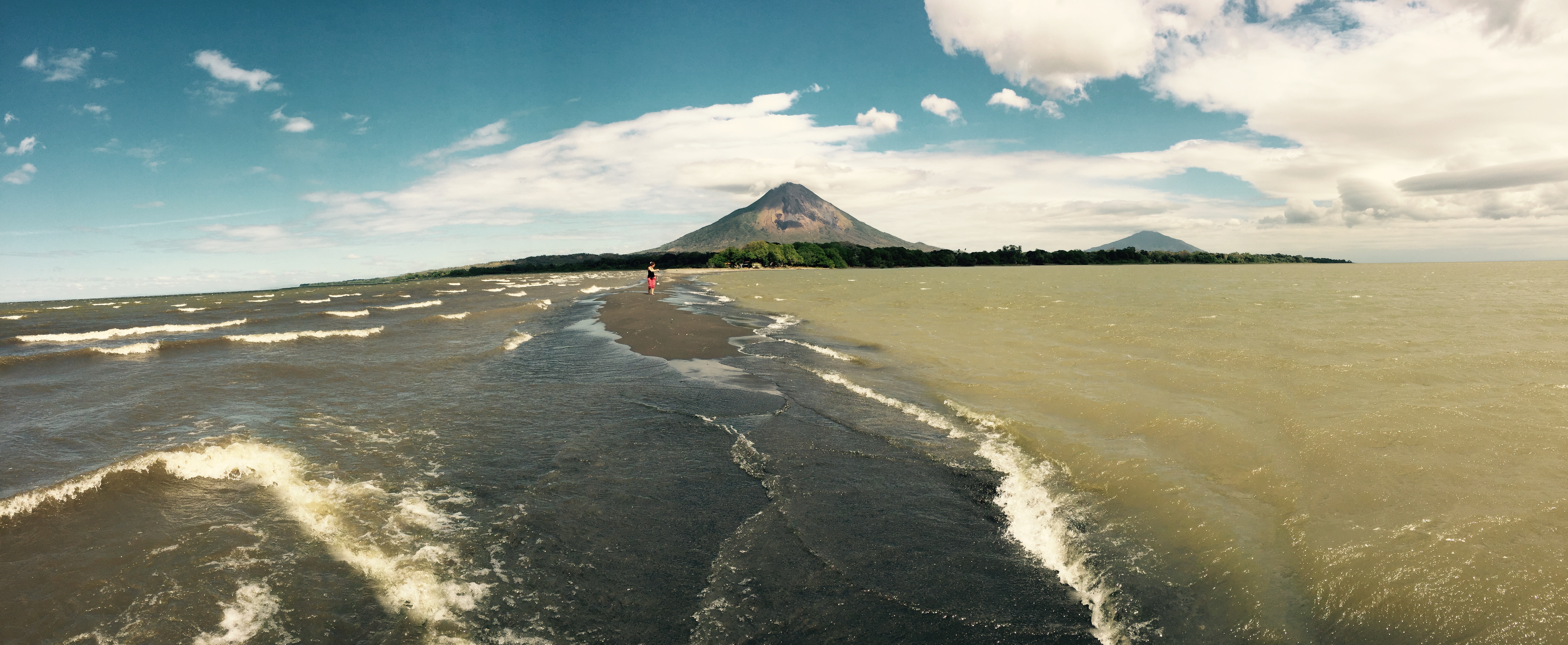 Ich bin auf der Märcheninsel Ometepe. Eine Insel im Lago Nicaragua, dem grössten See in Zentralamerika. 90 mal so gross wie der Zürisee. Oder 15 mal den Bodensee. Die Insel selber ist etwa so gross wie der Kanton Zug. Es ist die grösste vulkanische Insel in einem Süsswassersee der Welt, weiss Wikipedia. imageAuf Ometepe hat es zwei spektakuläre Vulkane, Wasserfälle, Flüsse, Blumen, Dschungel, wenig Menschen, viele Tiere, viele Affen vor allem und eine lange Beach. Dort fühlt es sich an wie am Meer. Das andere Ufer sieht man nicht. Weils sehr windig ist ein Schlaraffenland für Skite-Surfer. Der See ist aber nicht ganz ungefährlich, darin leben Bullsharks. Bullenhaie. Gehören zu den aggressivsten Haie überhaupt. Und sie halten sich gerne in der Uferzone auf. Aber ich bin ja eh nicht wegen der Beach hierher gekommen, da bin ich auf Corn Island voll auf meine Kosten gekommen. Dort bin ich mit den lieben Nurse-Sharks geschnorchelt! Habe ich im letzten Eintrag gar nicht erwähnt. Die beiden Ometepe-Vulkane besteigen wollen wir nicht. Der kleinere Maderas ist eingepackt in Dschunglewald. Da läuft man vier Stunden hoch und ist immer im Wald, hat also wenig Aussicht. Wenn man dann mal Aussicht hätte, ist sie zu 70% durch Wolken oder Nebel verdeckt. Vom grossen Concepcion hätte man zwar eine Wahnsinns Aussicht. Die beschwerliche zwölfstunden Wanderung ist aber eher für Hardcore-Wanderfüdlis gedacht. Also wandern wir im flachen Teil. Zum Beispiel zum «Punta Jesus Maria». Dort kommen die Strömungen des Sees zusammen. Die Wellen treffen aufeinander, haben dadurch eine kilometerlange Sandbank gebildet, welche knapp vom Wasser bedeckt wird. Da kannst du wie Jesus in den See rauslaufen. Im Hintergrund die beiden Vulkane. Wirklich eindrücklich.
